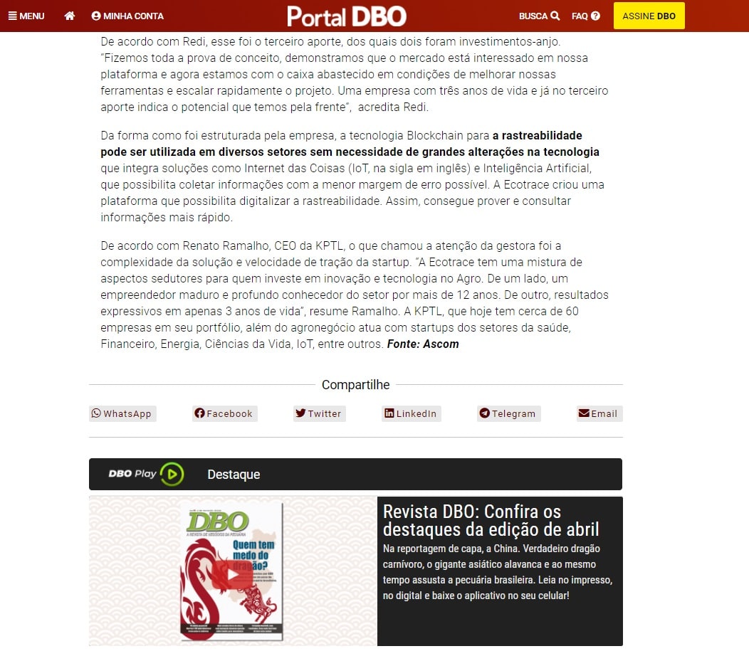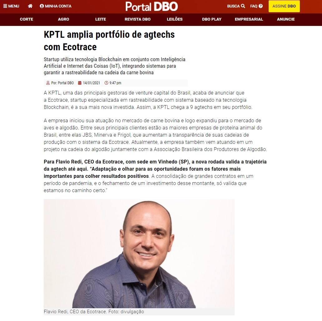 De acordo com Renato Ramalho, CEO da KPTL, o que chamou a atenção da gestora foi a complexidade da solução e velocidade de tração da startup. “A Ecotrace tem uma mistura de aspectos sedutores para quem investe em inovação e tecnologia no Agro. De um lado, um empreendedor maduro e profundo conhecedor do setor por mais de 12 anos. De outro, resultados expressivos em apenas 3 anos de vida”, resume Ramalho. A KPTL, que hoje tem cerca de 60 empresas em seu portfólio, além do agronegócio atua com startups dos setores da saúde, Financeiro, Energia, Ciências da Vida, IoT, entre outros.