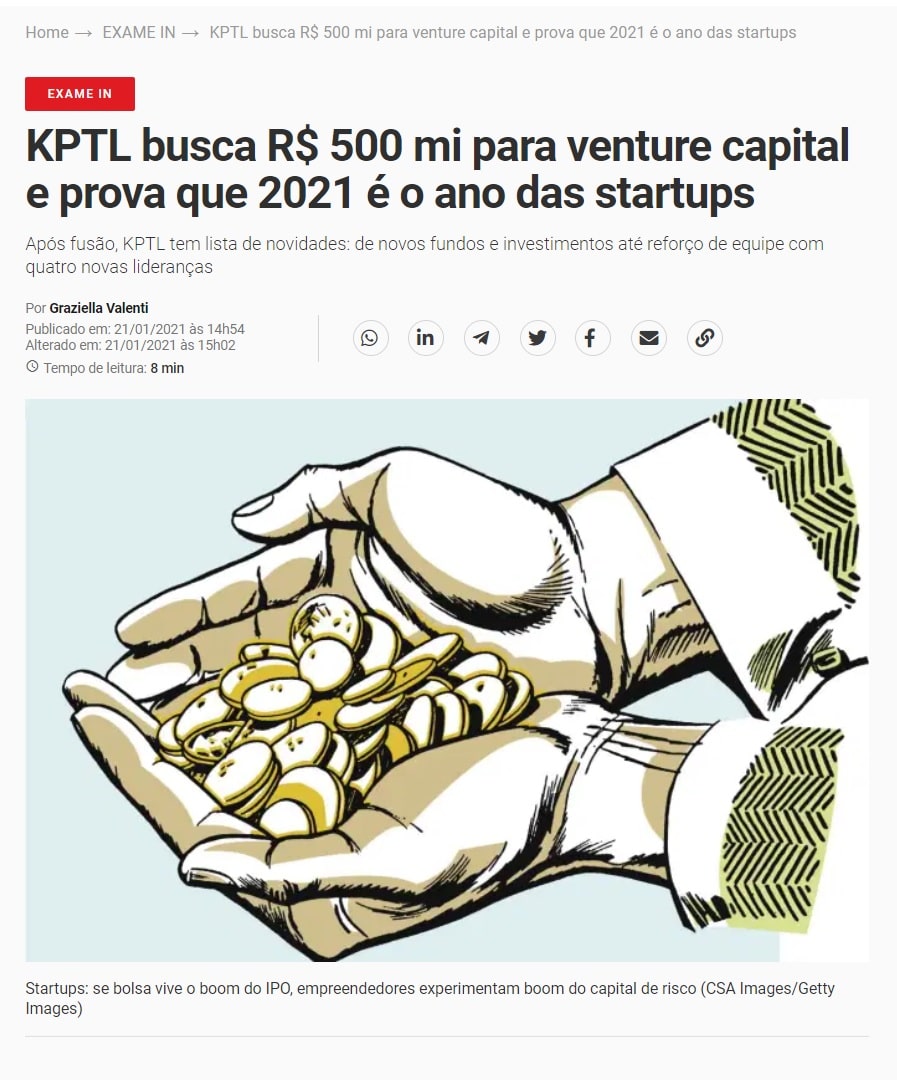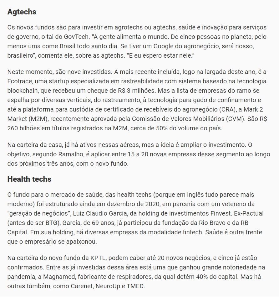 Na carteira do novo fundo da KPTL, podem caber até 20 novos negócios, e cinco já estão confirmados. Entre as já investidas dessa área está uma que ganhou grande notoriedade na pandemia, a Magnamed, fabricante de respiradores, da qual detém 40% do capital. Mas há outras também, como Carenet, NeuroUp e TMED.