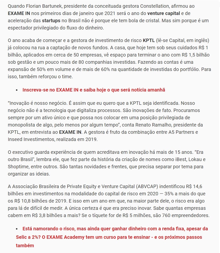 Quando Florian Bartunek, presidente da conceituada gestora Constellation, afirmou ao EXAME IN nos primeiros dias de janeiro que 2021 será o ano do venture capital e de aceleração das startups no Brasil não é porque ele tem bola de cristal. Mas sim porque é um espectador privilegiado do fluxo do dinheiro.