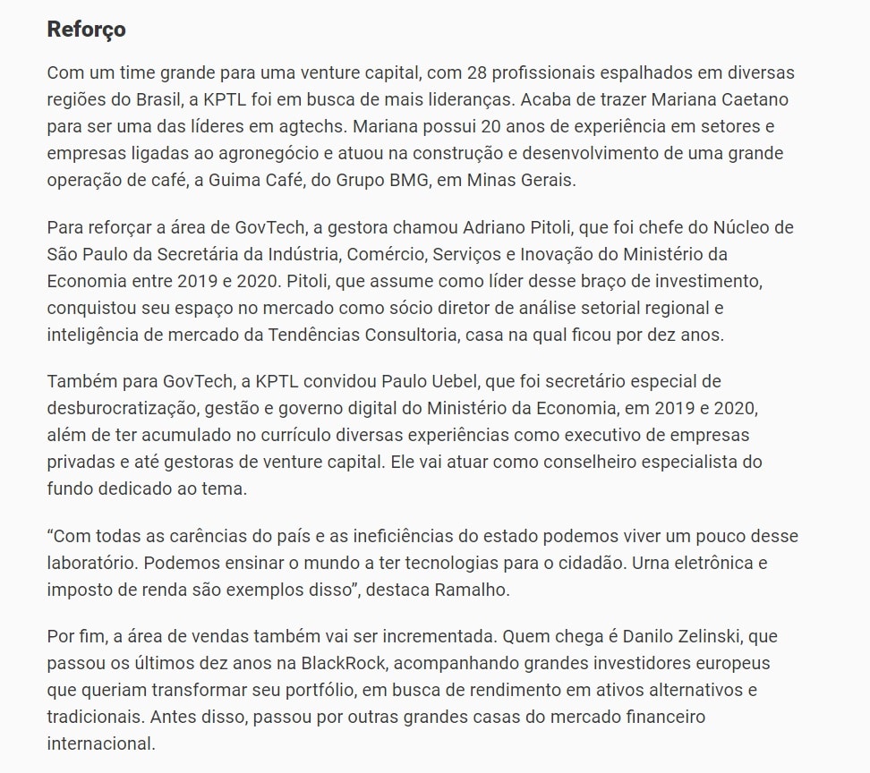 Com um time grande para uma venture capital, com 28 profissionais espalhados em diversas regiões do Brasil, a KPTL foi em busca de mais lideranças. Acaba de trazer Mariana Caetano para ser uma das líderes em agtechs. Mariana possui 20 anos de experiência em setores e empresas ligadas ao agronegócio e atuou na construção e desenvolvimento de uma grande operação de café, a Guima Café, do Grupo BMG, em Minas Gerais.