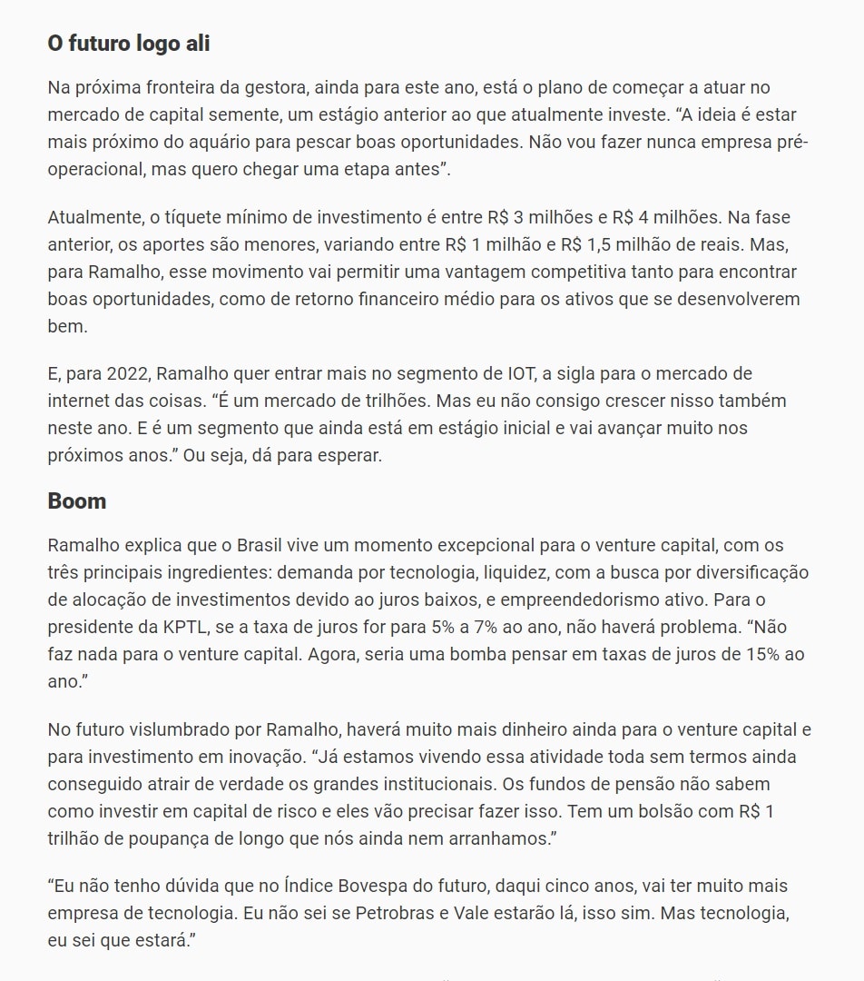 Ramalho explica que o Brasil vive um momento excepcional para o venture capital, com os três principais ingredientes: demanda por tecnologia, liquidez, com a busca por diversificação de alocação de investimentos devido ao juros baixos, e empreendedorismo ativo. Para o presidente da KPTL, se a taxa de juros for para 5% a 7% ao ano, não haverá problema. “Não faz nada para o venture capital. Agora, seria uma bomba pensar em taxas de juros de 15% ao ano.”