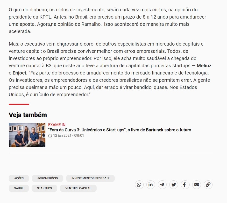Mas, o executivo vem engrossar o coro de outros especialistas em mercado de capitais e venture capital: o Brasil precisa conviver melhor com erros empresariais. Todos, de investidores ao próprio empreendedor. Por isso, ele acha muito saudável a chegada do venture capital à B3, que neste ano teve a abertura de capital das primeiras startups — Méliuz e Enjoei. “Faz parte do processo de amadurecimento do mercado financeiro e de tecnologia. Os investidores, os empreendedores e os credores brasileiros não se permitem errar. A gente precisa queimar a mão um pouco. Aqui, dar errado é virar bandido, quase. Nos Estados Unidos, é currículo de empreendedor.”